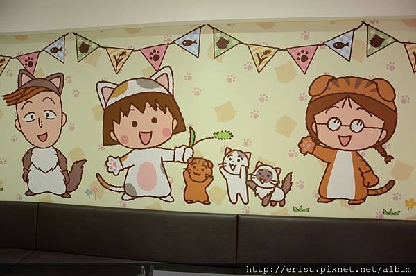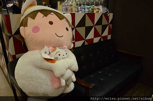 老闆為了讓小丸子粉絲有新鮮感,把小丸子變成可愛喵星人,超大玩偶和粉絲一起坐沙發拍照,記得不要觸碰喔!