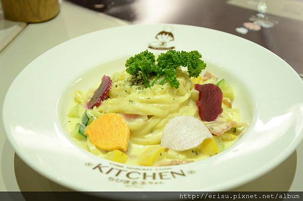 愛吃麵麵的羊妞,我們幫她點了「奶油培根細扁麵」。