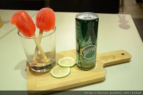 原來先把氣泡水倒入,再把蔓越莓口味的小丸子、花輪冰棒放進攪拌,最後放入檸檬片,就完成啦!